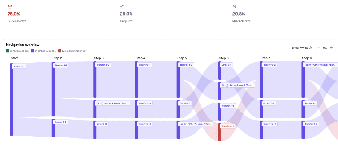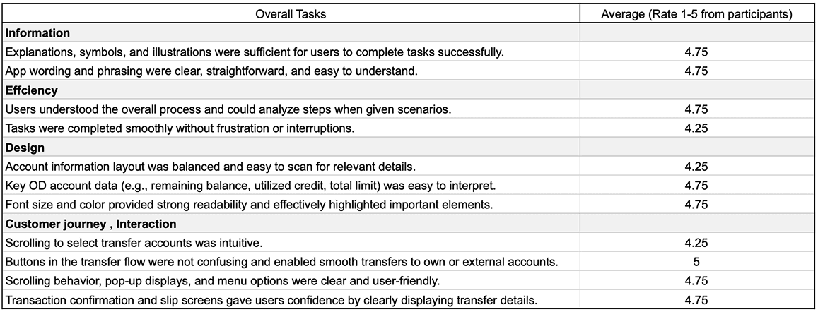 We conducted both face-to-face usability testing and remote testing via Maze.com. Overall, the results were positive — users of the Overdraft account were able to clearly understand the account information and perform inter-account transfers without friction. In addition, Key Performance Indicators (KPIs) and a System Usability Scale (SUS) score projection were applied as standardized benchmarks to evaluate the user experience.